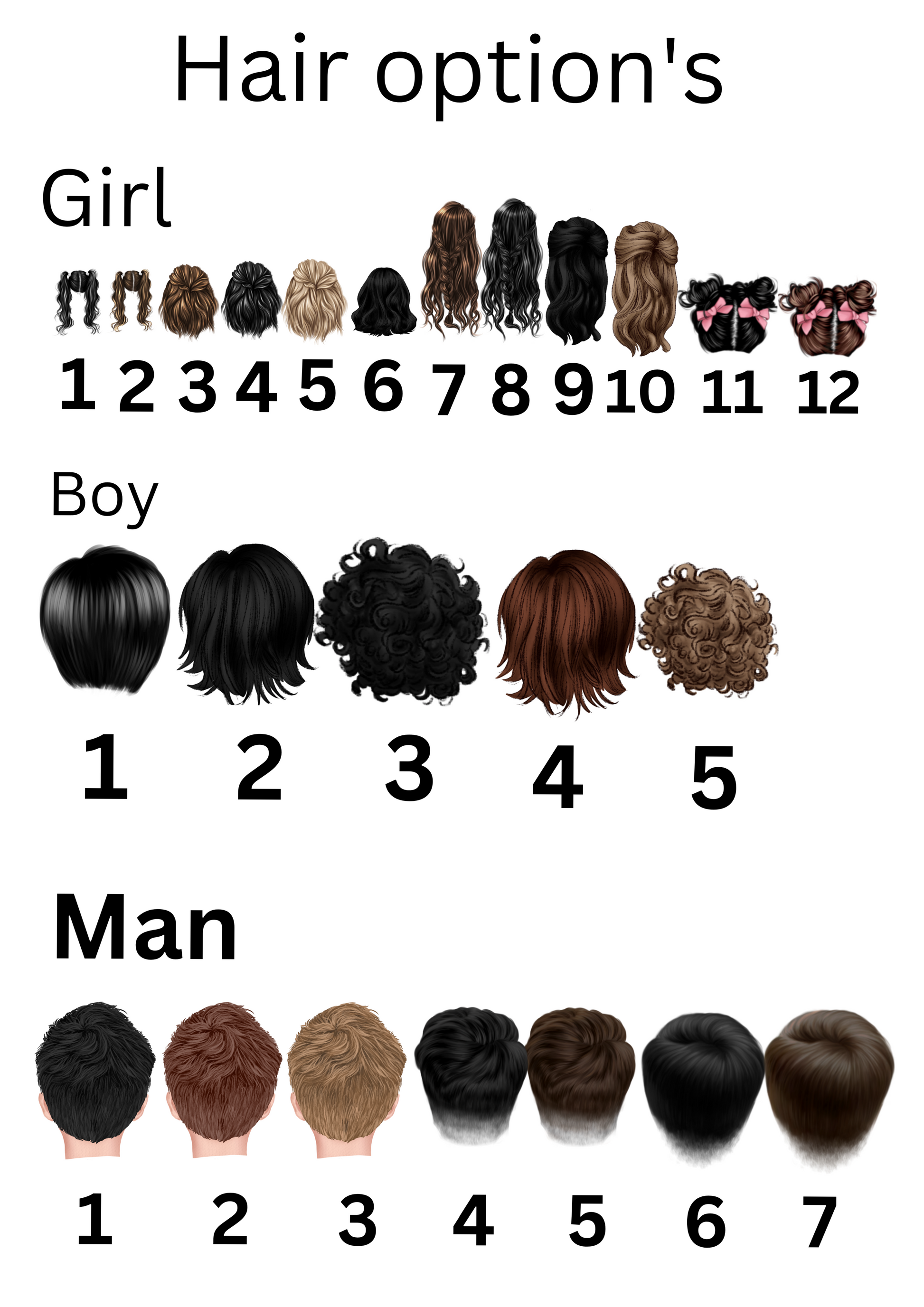 PLEASE PROVIDE THE NAME MALE/FEMALE CLOTHES HAIR AND AGE IN ORDER YOU REQUIRE THE PRINT.