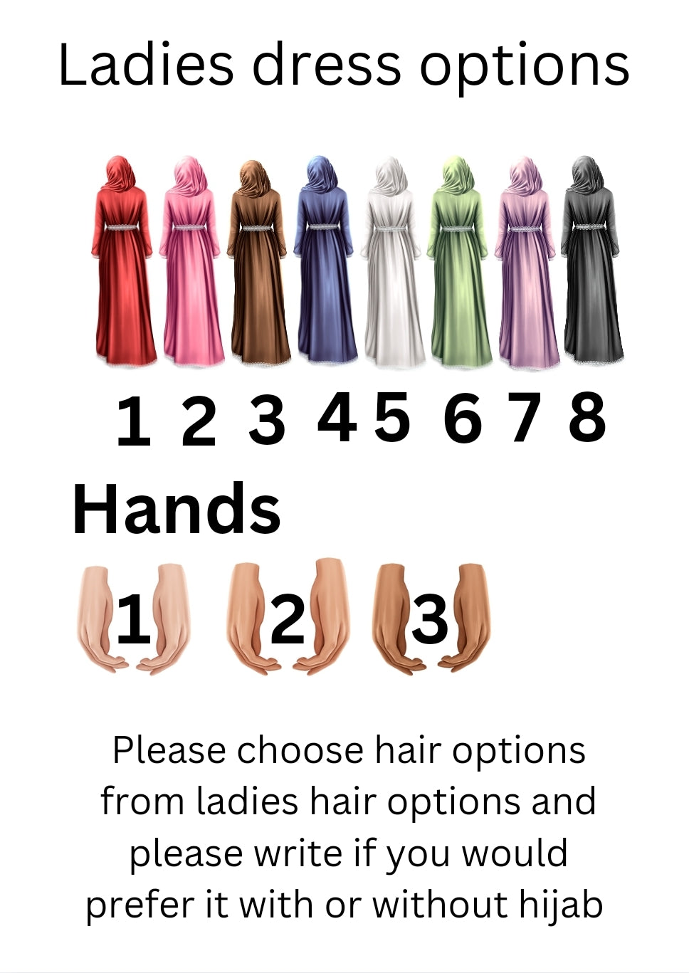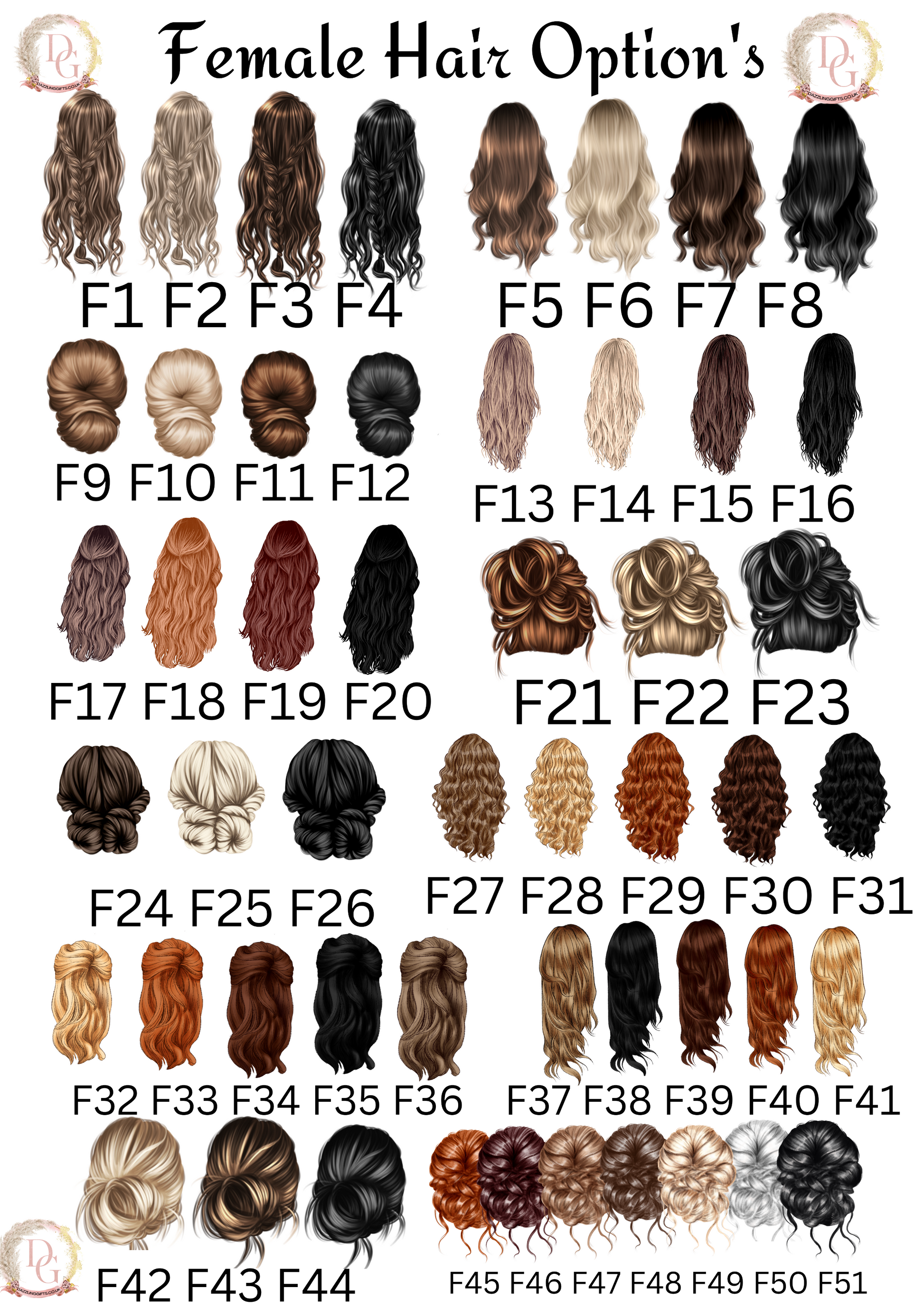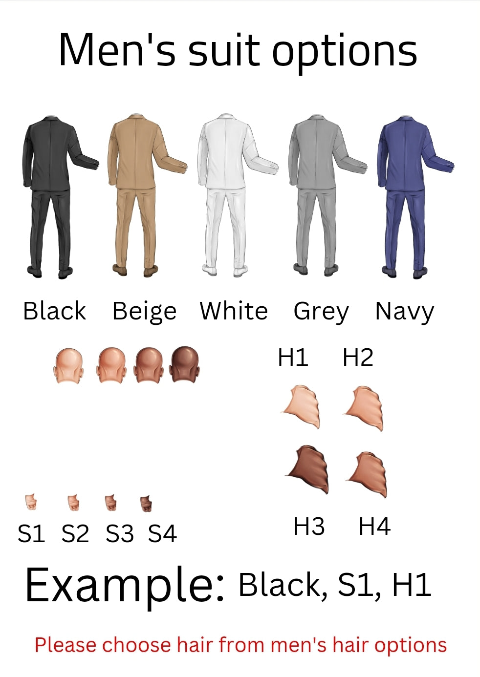PLEASE PROVIDE THE NAMES MALE & FEMALE CLOTHES AND HAIR FROM OPTIONS IN IMAGES.