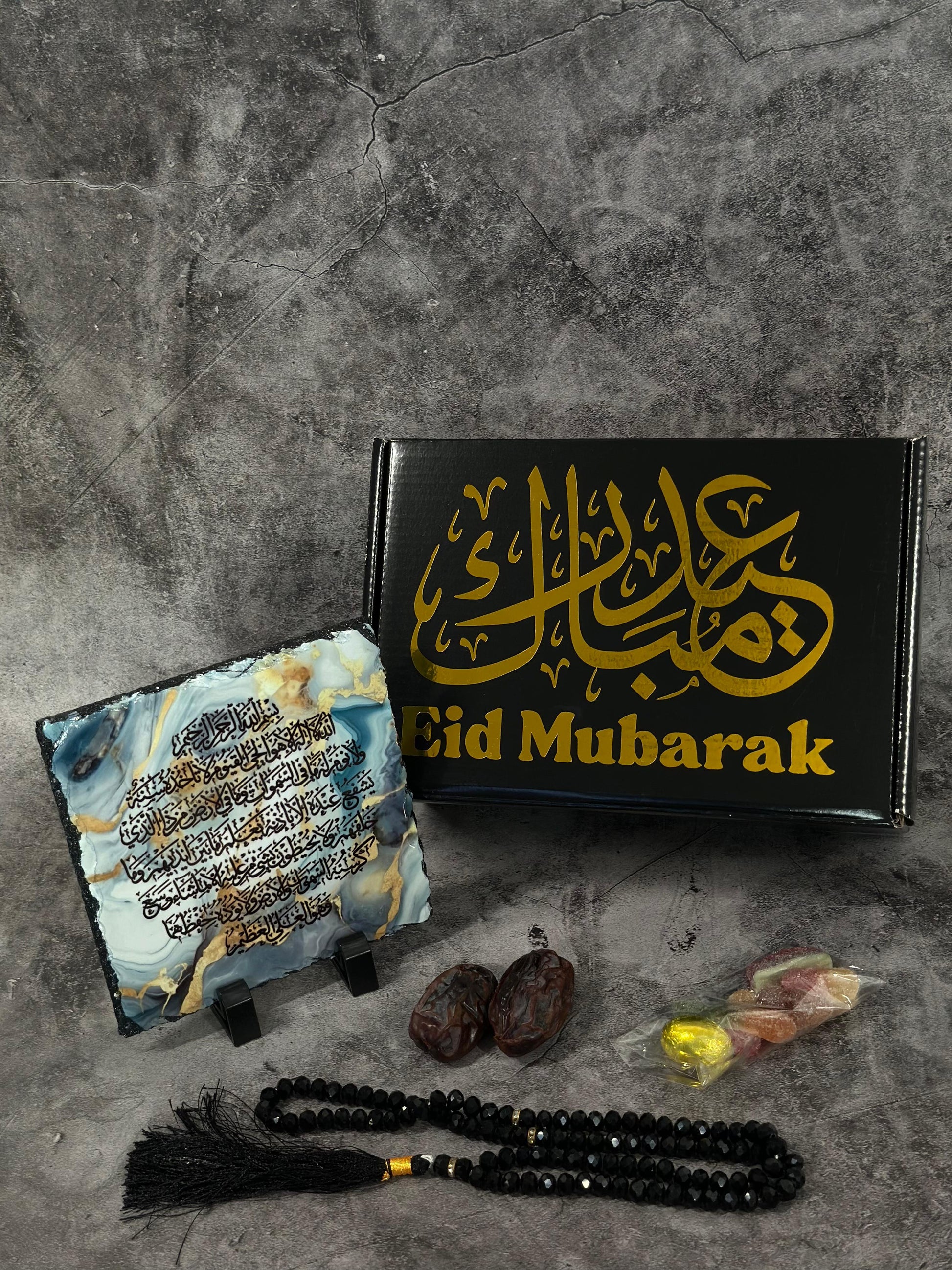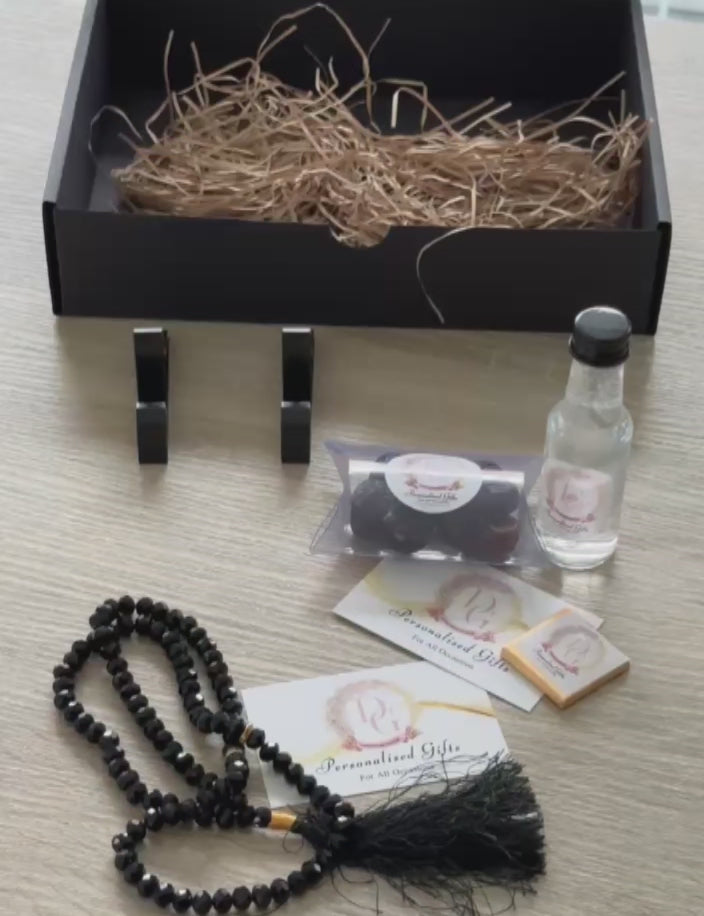 Give a thoughtful gift with this small Giftbox. Included are a Islamic small slate 15cm by 15cm, a Kajoor box for treats, a 50ml Zam Zam bottle, a tasbih for Dhikr and a giftbox to store all items. Each item is carefully chosen to bring joy and blessings for any occasion.