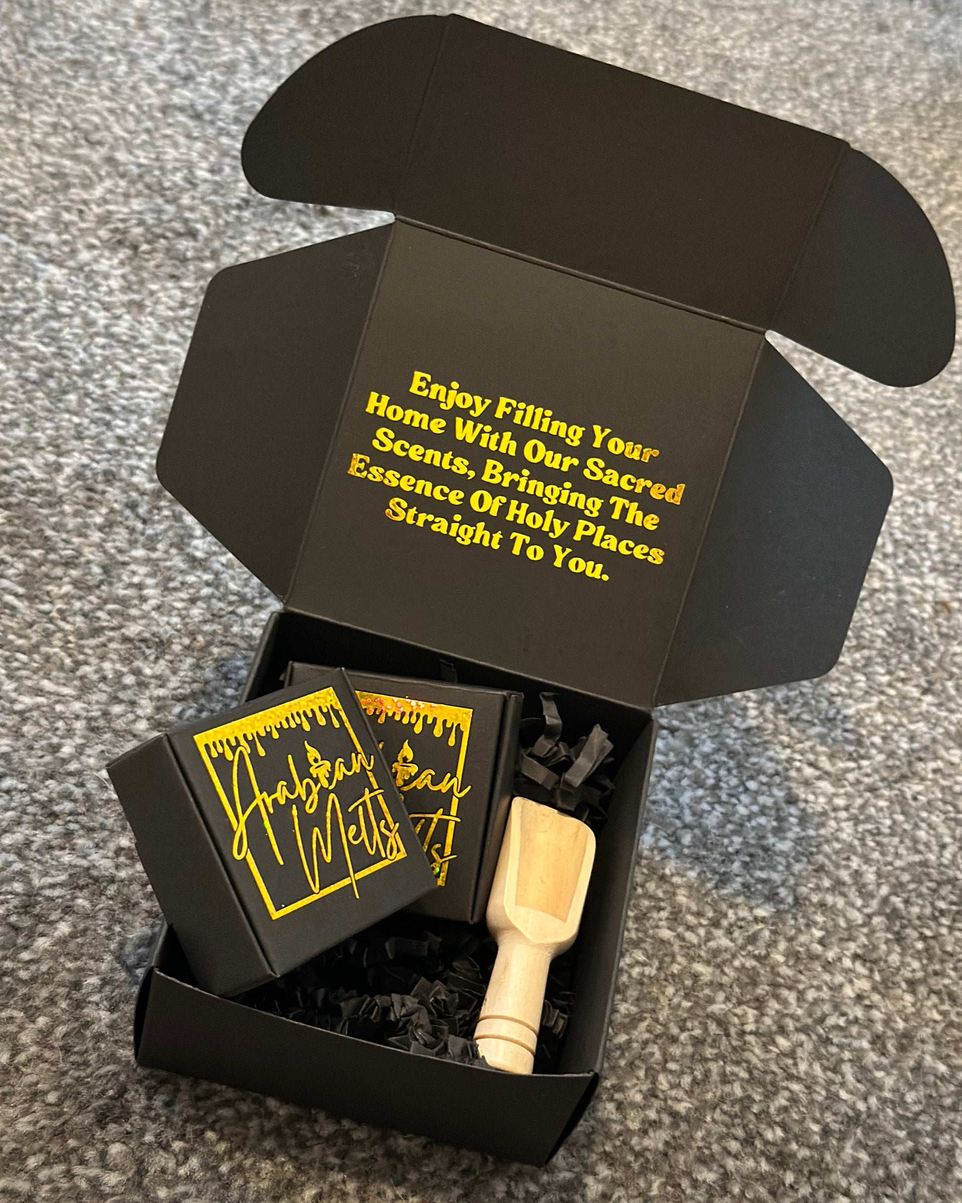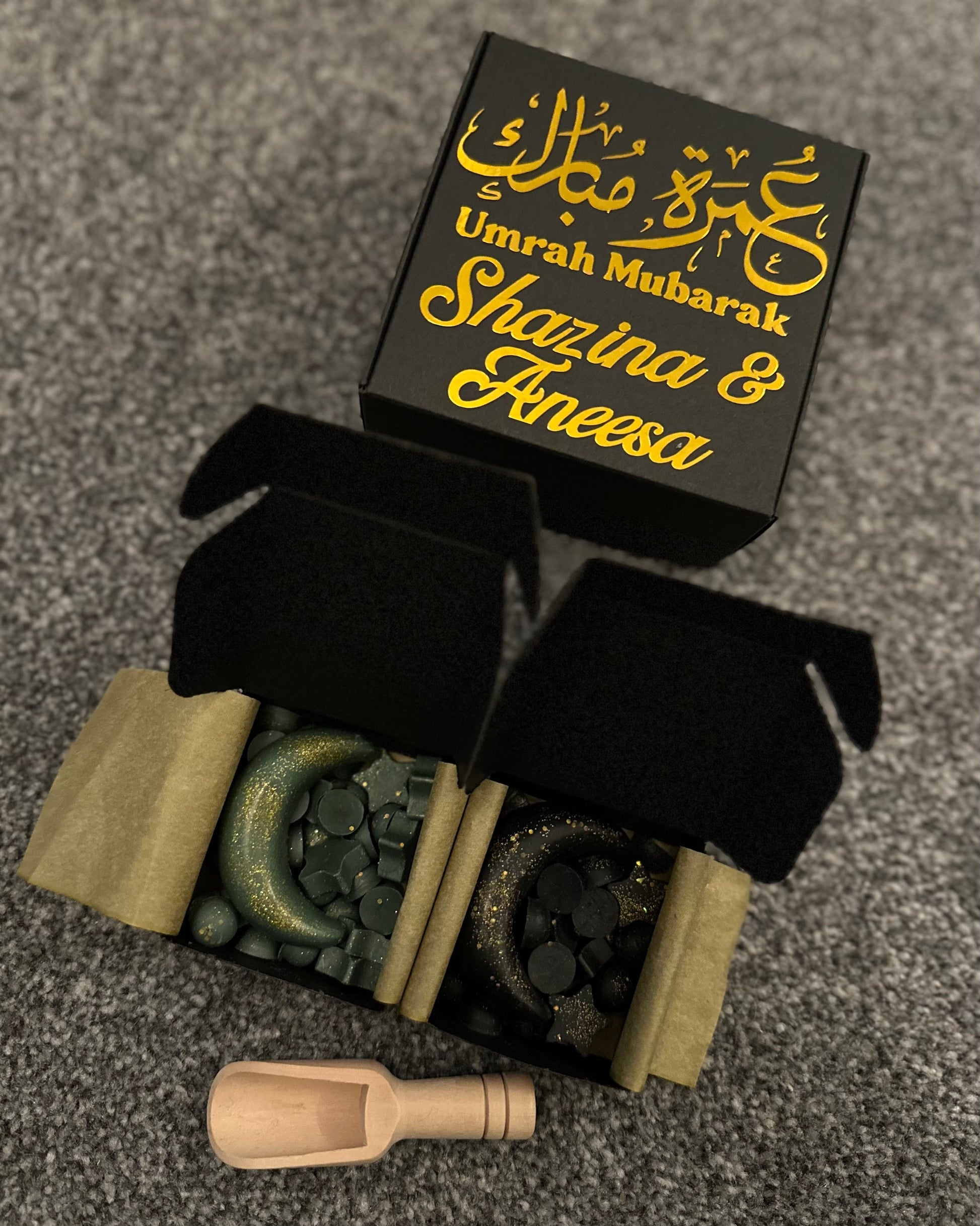 Immerse yourself in a truly spiritual and aromatic experience with our Scoopie Wax Melts, inspired by the most sacred places. This set includes two mini boxes of scoopable wax melts, where you can choose two fragrances from three divine scents: Kaaba, Masjid Nabwi, and Hajr E Aswad.