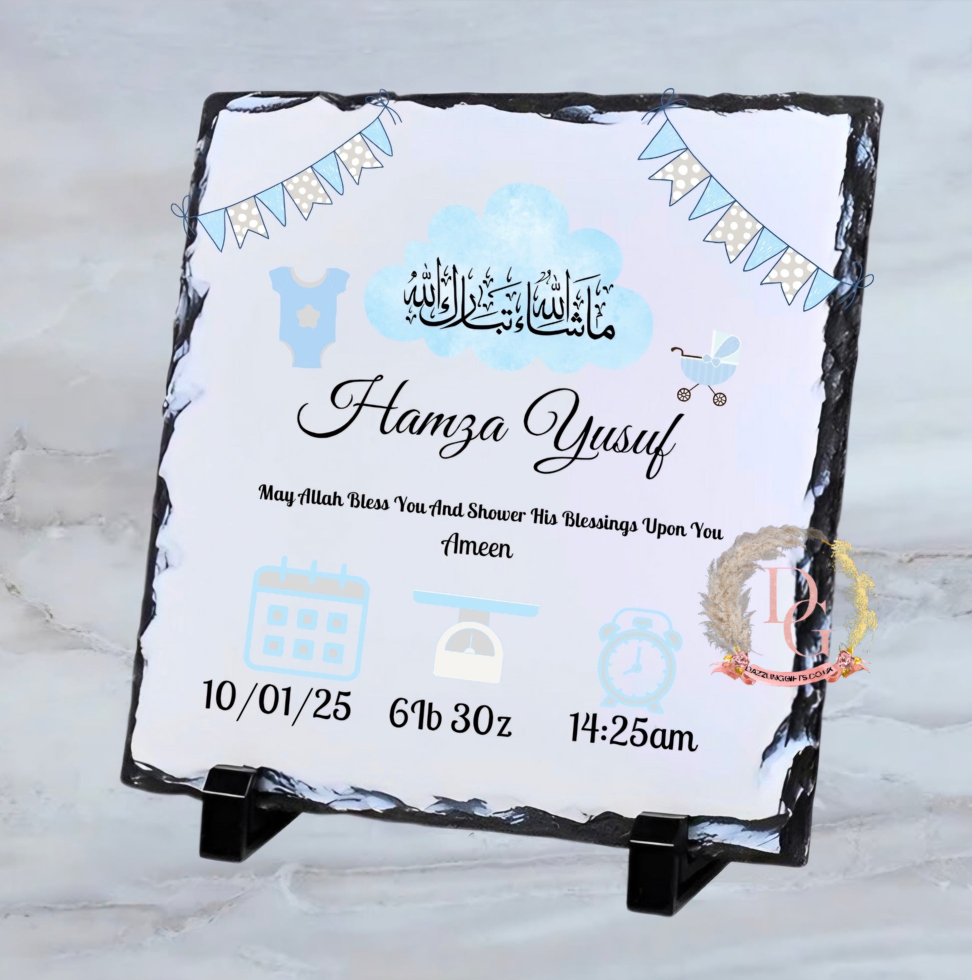 A gorgeous personalised rock slate ideal for a new baby gift. A great keepsake for their important day and all the specific details.
