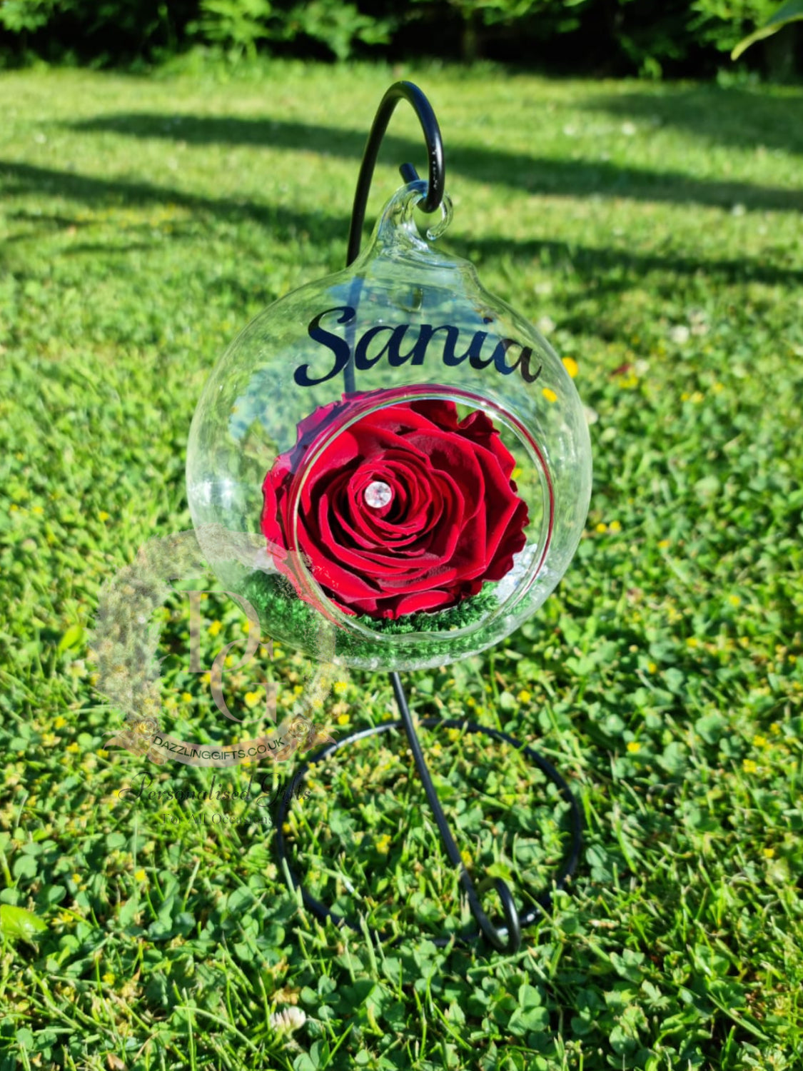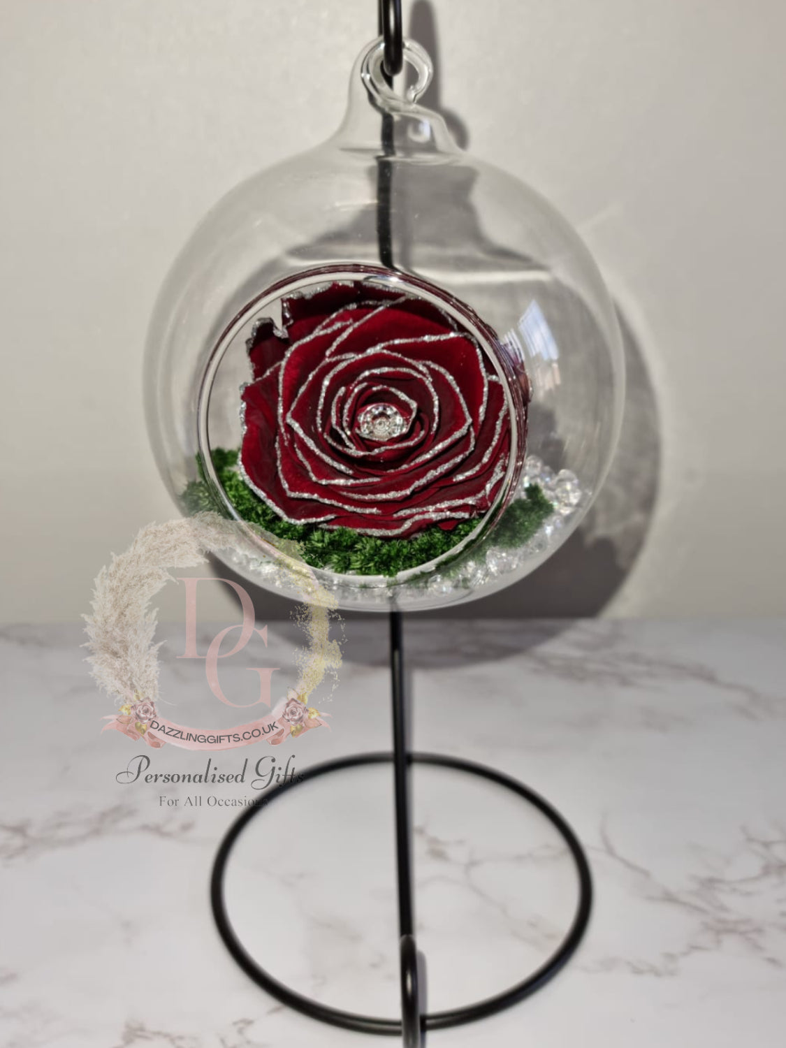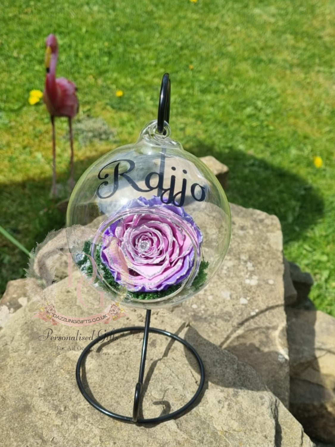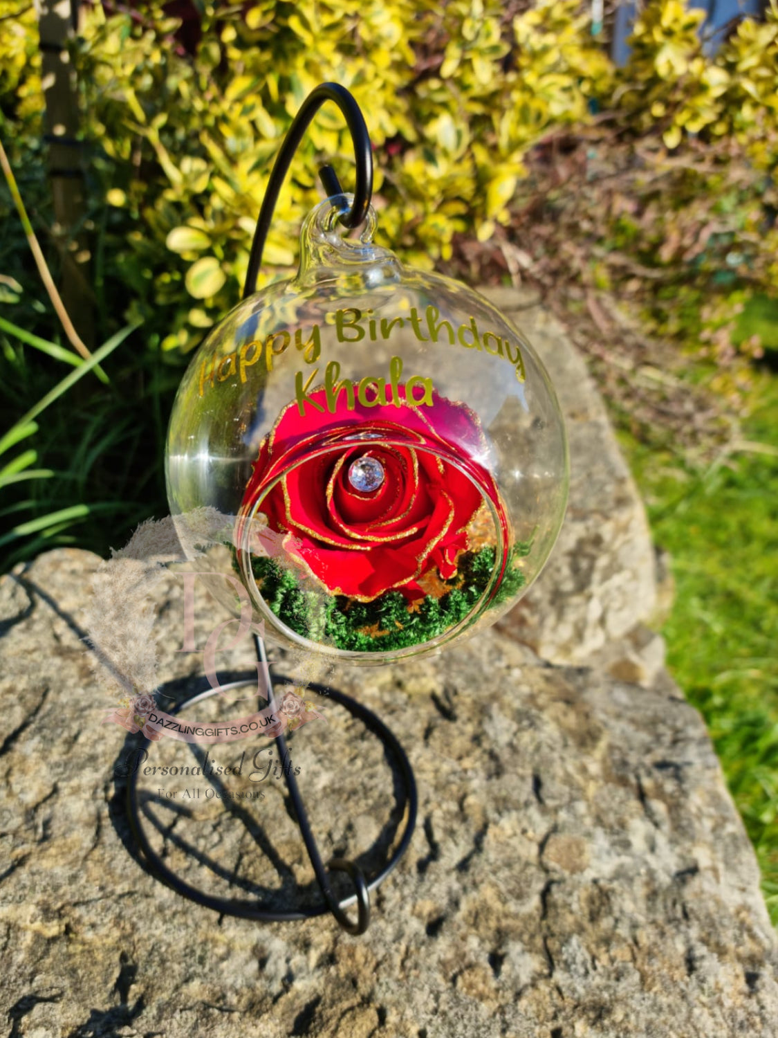 This beautiful elegant open sphere bauble displays a perfectly in bloom single Preserved Rose and makes a stunning gift.